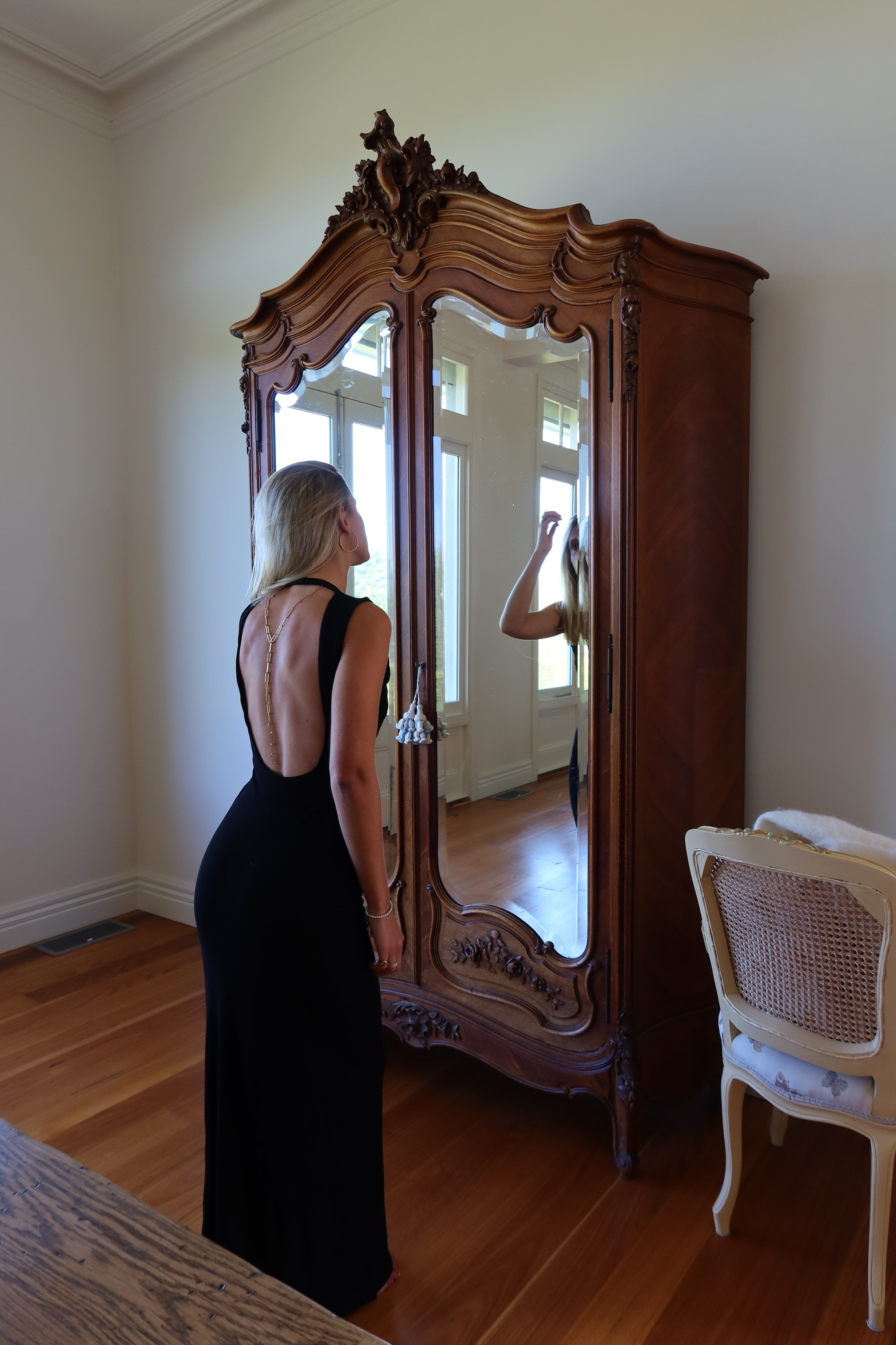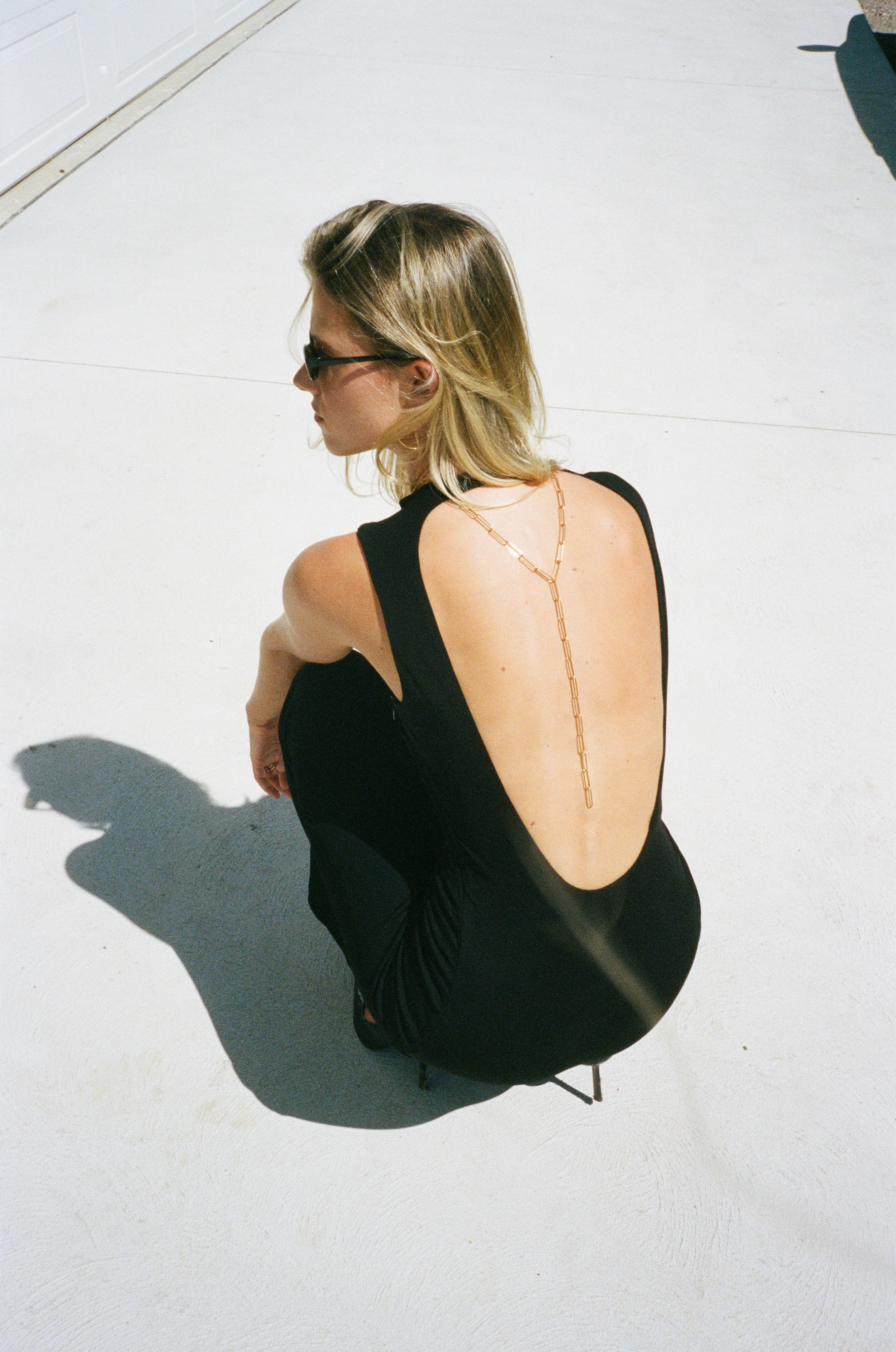 Bringing you the perfect timeless black dress, with a deep scoop detailed neckline. Please note, the gold chain is not part of the dress.