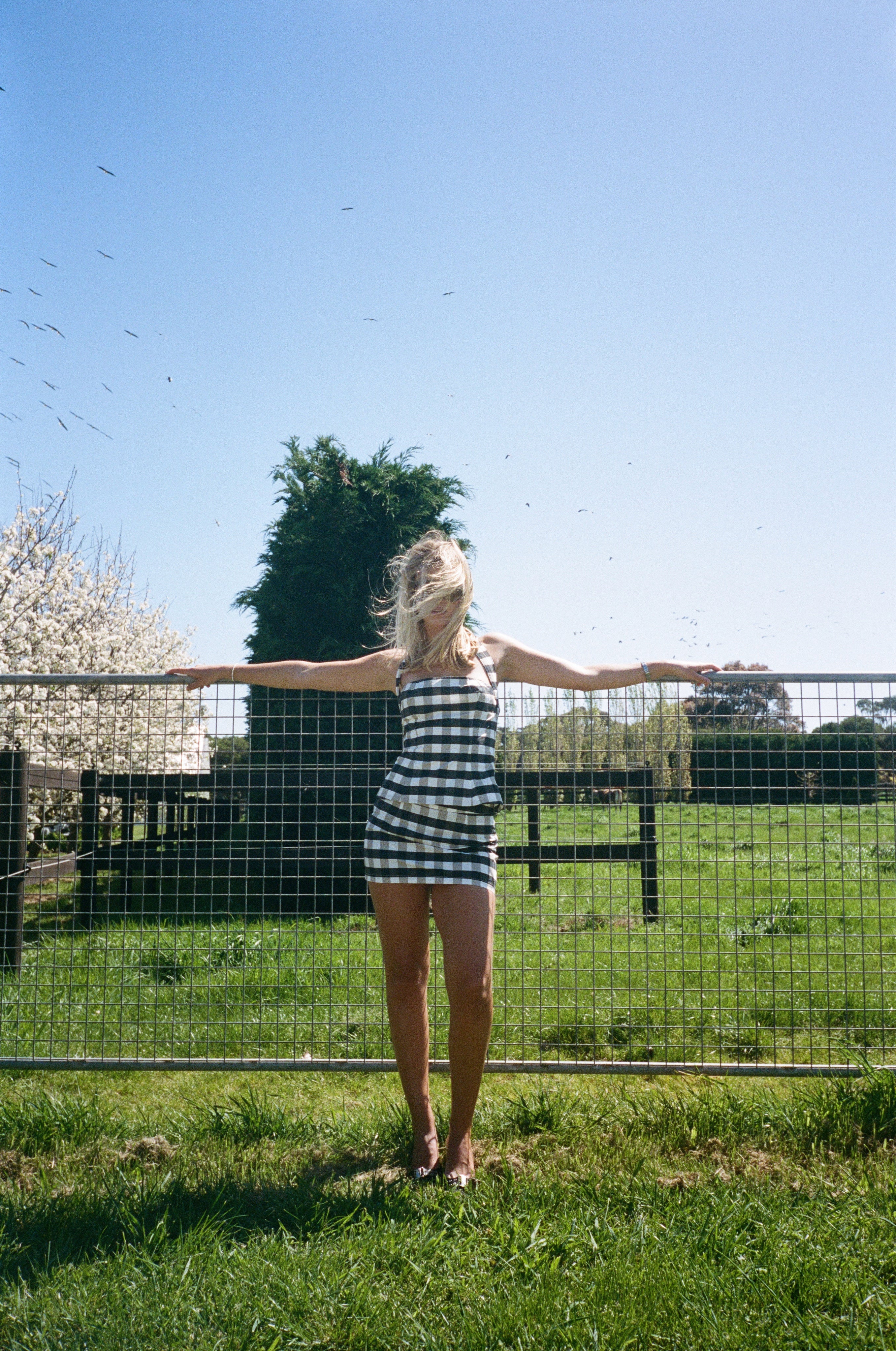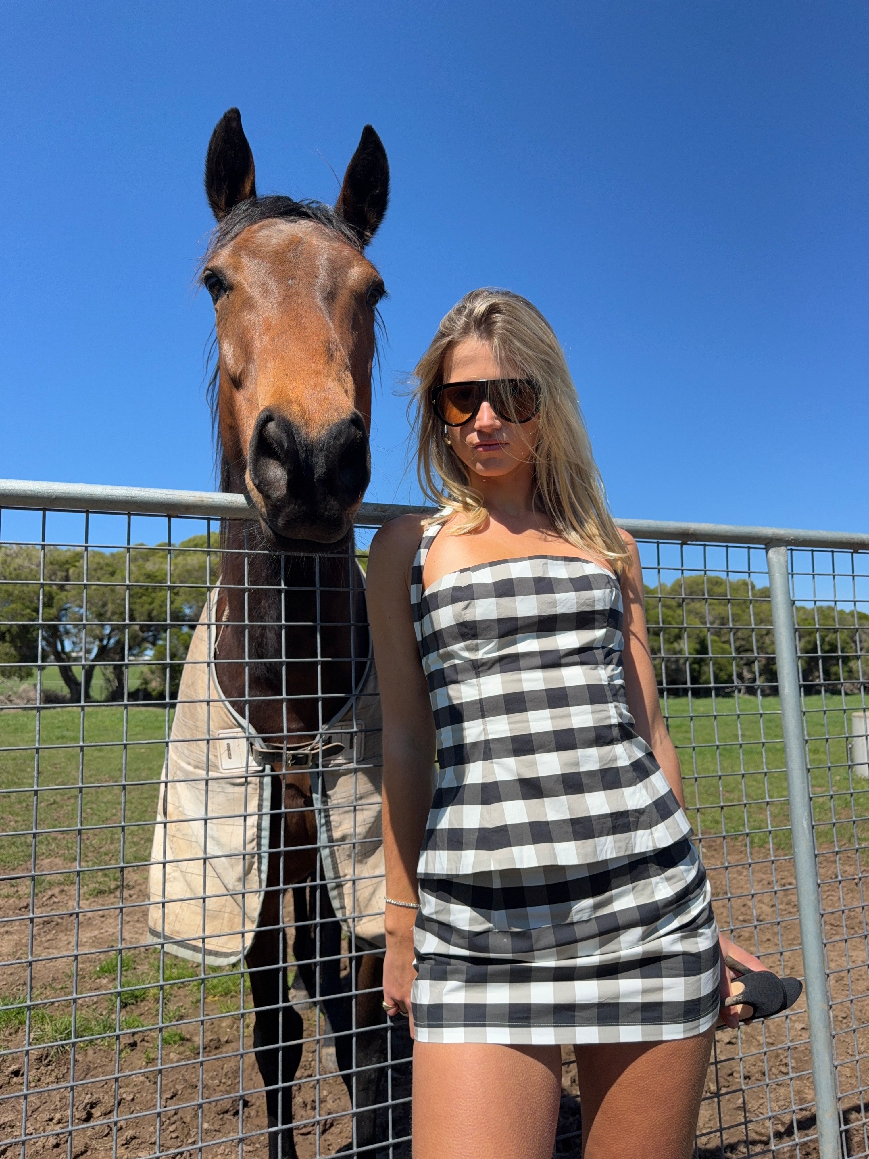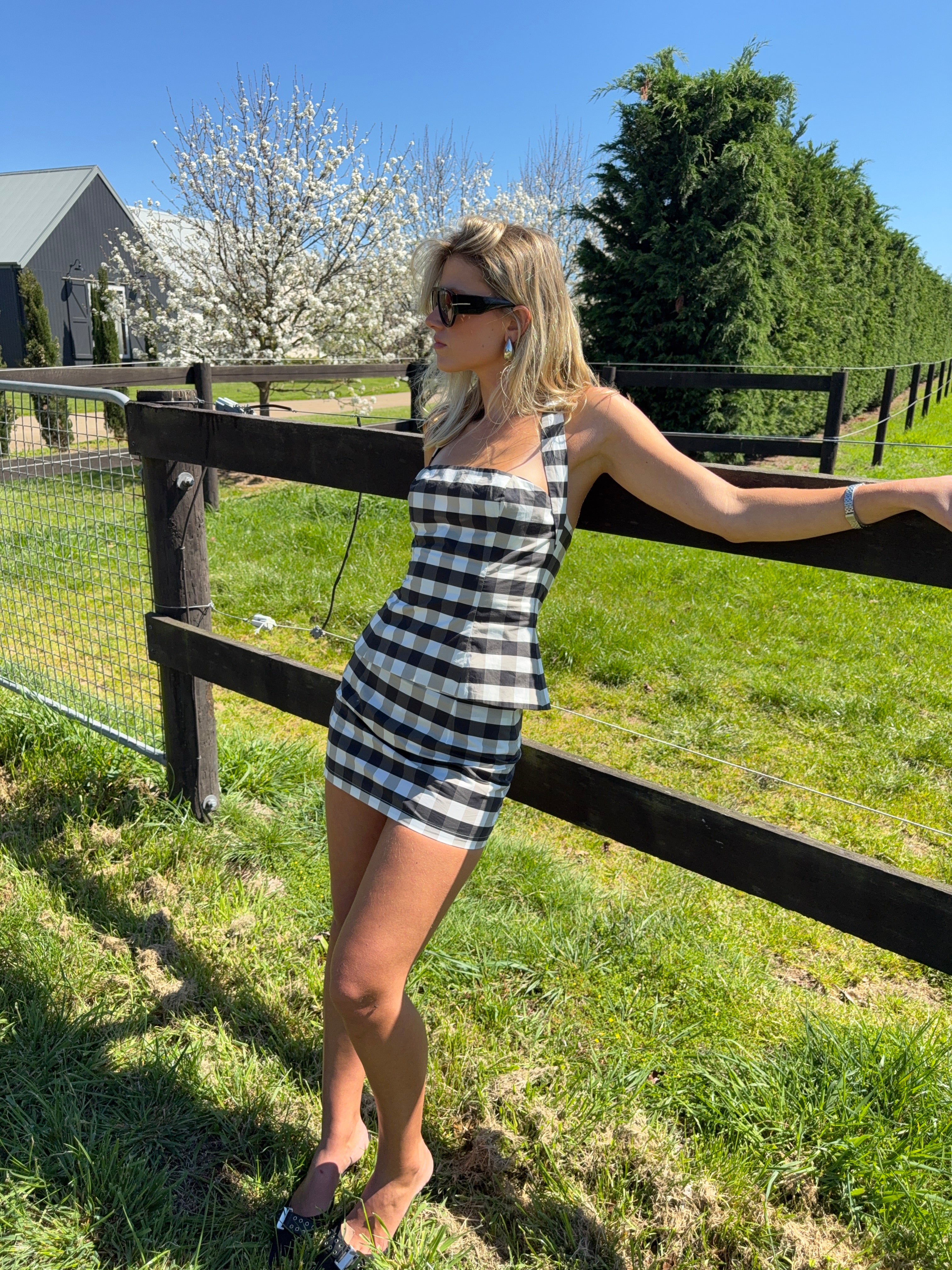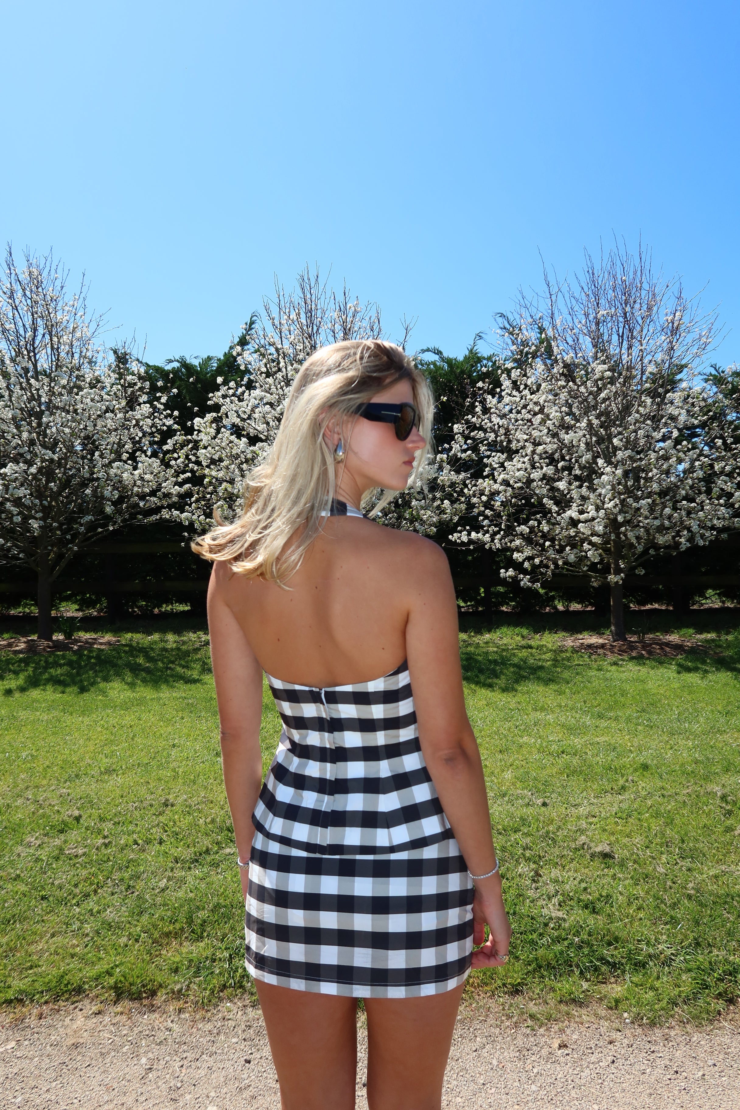 This chic black-and-white gingham two-piece set features a fitted halter top paired with a matching mini skort.